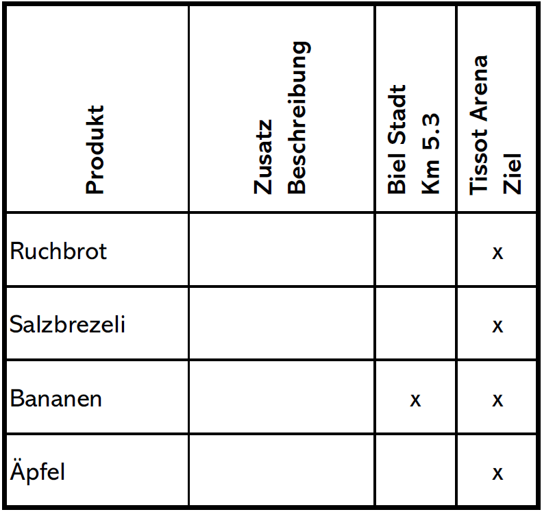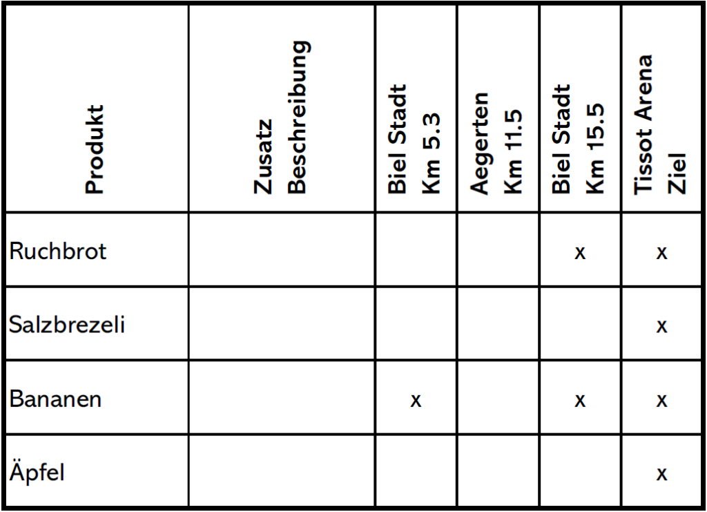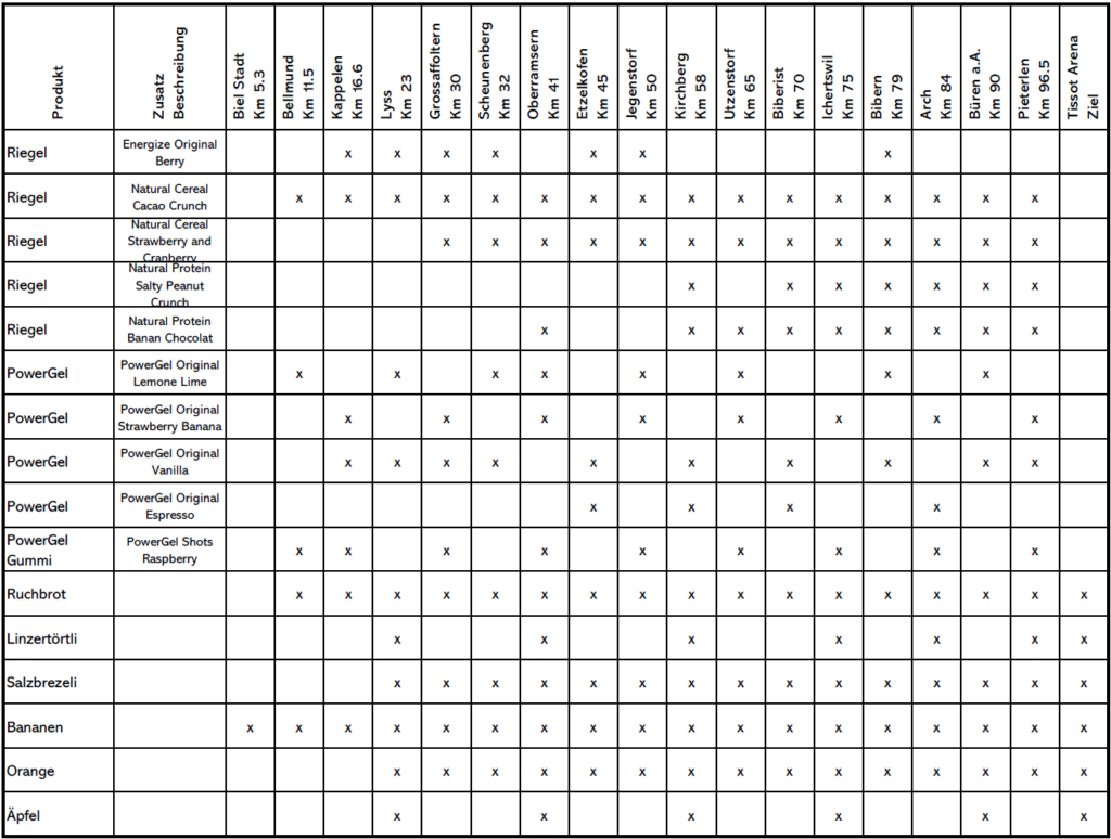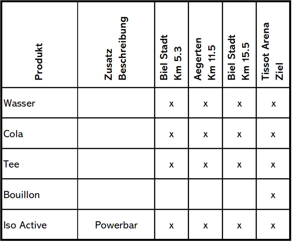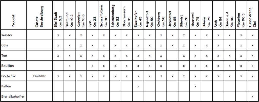 An den Verpflegungsposten entlang der Strecke stehen folgende Verpflegungsmöglichkeiten zur Verfügung: